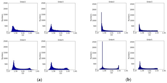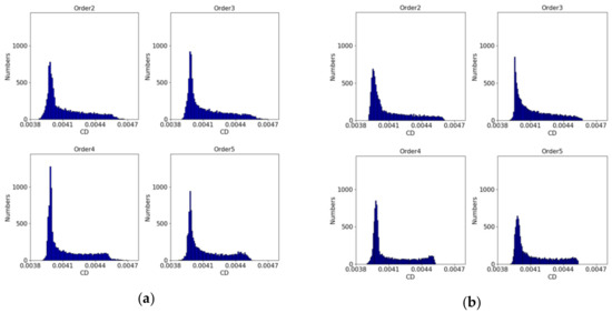 The distributions of the probability density functions of the drag coefficients are plotted with variation of the order in