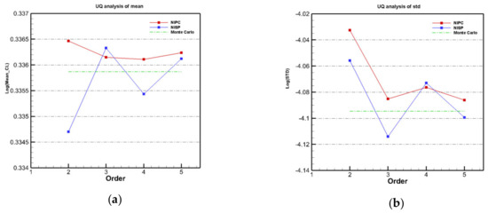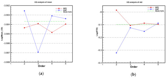 Figure 3 shows the convergence of the mean and STD of the drag coefficient according to the polynomial order of the two methods. The long dashed line is the reference value, which corresponds to the Monte Carlo results. The point-collocation NIPC showed faster convergence of the mean and STD than NISP and consistent values except for the case with second order. However, in NISP, the results of the odd number orders (third and fifth orders) are close to the Monte Carlo results and the results of the even number orders (second and fourth orders) have some discrepancies compared to the reference values.