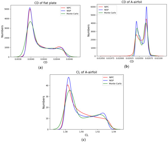 The mean value and STD of the drag and lift coefficients of the Aerospatiale A-Airfoil were calculated using the point-collocation NIPC, NISP, and Monte Carlo methods. The number of samples of Monte Carlo was 500, which was the same as in the previous case.