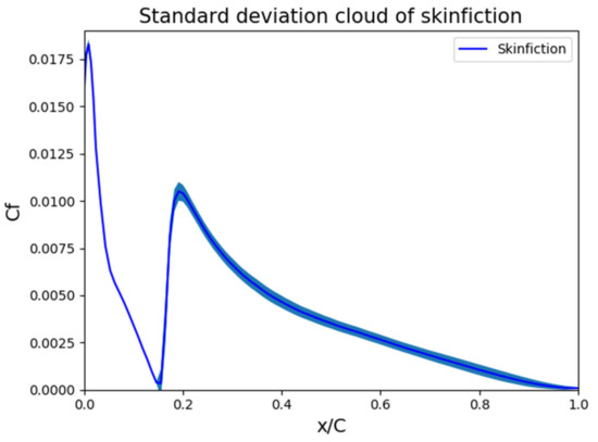 Figure 12 displays the distribution of the skin friction coefficient from point-collocation NIPC at the fifth order. It was confirmed that the change of the model coefficients had a significant effect on the variation of the skin friction coefficient at the location of the flat plate. There was a small STD before the transition point (i.e., laminar flow region) and then a large STD after the transition (i.e., developing turbulent flow region). This means that the model closure coefficients had a large effect on the turbulent flow region of the deterministic solution.