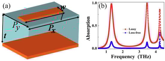 (a) Three-dimension unit cell of triple-band light absorber; (b) absorption spectra of the triple-band light absorber having the dielectric constant of lossy (or imaginary part is not zero, see red curve) and loss-free (or imaginary part is zero, see blue curve).