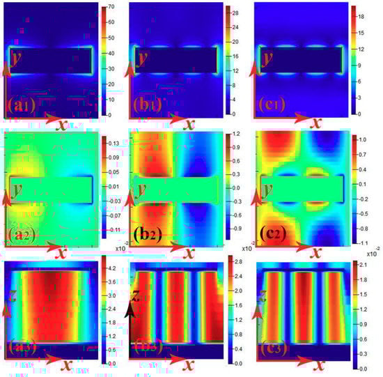 Field distributions of |E| (a1), real Ez (a2), and |Hy| (a3) for resonance at 1.316 THz; Field distributions of |E| (b1), real Ez (b2), and |Hy| (b3) for resonance at 3.474 THz; Field distributions of |E| (c1), real Ez (c2), and |Hy| (c3) for resonance at 4.245 THz.