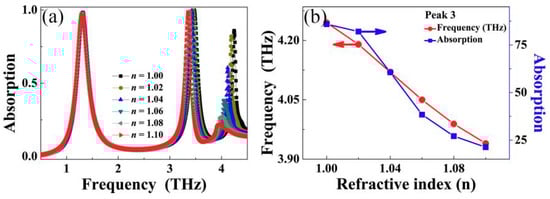 Generally, the sensing performance is a very important index for evaluating the narrow-band absorber. Here we first analyze the dependence of the absorption spectra on the refractive index change of the surrounding. As shown in Figure 3a, we observed that frequency and absorbance changes of the first resonance peak can be neglected, while the absorption performance of the last two modes has a large dependence on the change of the surrounding index. Different from the second peak having only frequency change, the third peak not only has the characteristics of frequency shift but also absorbance decrease.
