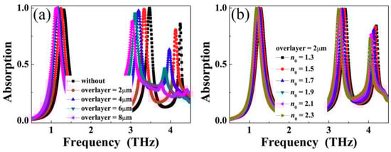 We also investigated the dependence of the absorption spectra on the overlayer thickness change of the triple-band absorber. It can be seen from Figure 4a that the frequencies of the three peaks are all blue-shift with the increase of the overlayer. The frequency changes of these peaks are due to the increase of the capacitance of the absorber. Besides the frequency shifts, the absorbances of these peaks are also decreased when the overlayer thickness is increased. For example, the variation ranges of the absorbances of the second and the third peaks are respective 11.45% and 53.19% when the thickness of the overlayer is changed from zero to 8 µm. Furthermore, we found that the refractive index of overlayer also affect the absorption performance of the triple-band absorber, see Figure 4b. These results prove that the designed triple-band absorber can be used for sensor applications by adding thickness (or changing the refractive index) of the overlayer.