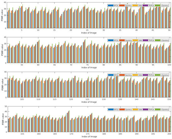 Comparison of the PSNR values with RPCA [4], Gamma [26], SNN [49], TRPCA [20] and t-Gamma.