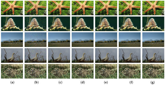 Recovery results on 5 sample images. The first two columns are original and corrupted images reps. The third to seventh columns are recovery images obtained by RPCA, Gamma, SNN, TRPCA and t-Gamma resp. (a) Original; (b) Corrupted; (c) RPCA [4]; (d) Gamma [26]; (e) SNN [49]; (f) TRPCA [20]; (g) t-Gamma.