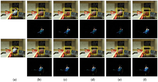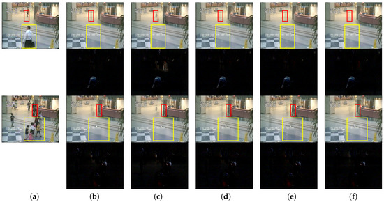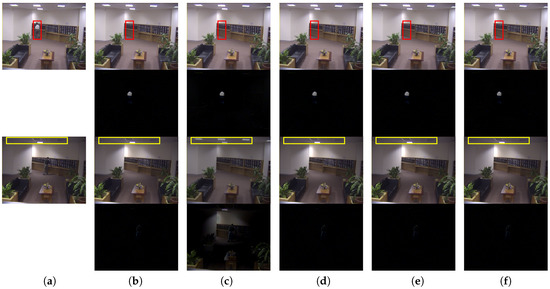 Background modeling: two example frames from MovedObject sequences are shown. (a) Original; (b) RPCA [4]; (c) Gamma [26]; (d) SNN [49]; (e) TRPCA [20]; (f) t-Gamma.