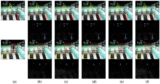 Background modeling: two example frames from Escalator sequences are shown. (a) Original; (b) RPCA [4]; (c) Gamma [26]; (d) SNN [49]; (e) TRPCA [20]; (f) t-Gamma.