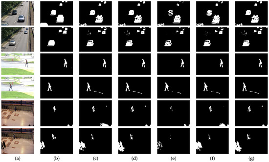 Visual results for CDNet dataset. Row 1 and row 2 are samples of highway; row 3 and row 4 are samples of pedestrians; row 5 and row 6 are samples of PETS2006. (a) Original; (b) Ground True; (c) RPCA [4]; (d) Gamma [26]; (e) SNN [49]; (f) TRPCA [20]; (g) t-Gamma