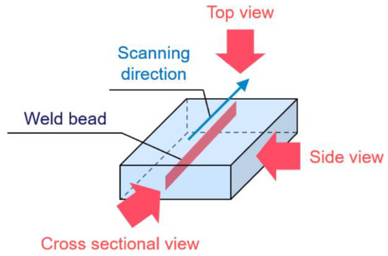 Figure 2 shows the schematic illustration of laser irradiation setup in bead-on-plate welding experiment. A picosecond pulsed laser of 1064 nm wavelength and 12.5 ps pulse duration was used as a laser source, which was tightly focused inside the glass specimen by an objective lens with spherical aberration correction. For fusion micro-welding by using ultrashort pulsed laser, 10 ps in pulse duration is typically preferable [25]. As this extreme short pulse duration makes it easy to achieve very high peak laser intensity with low pulse energies, and it shows better results such as nonlinear absorption inside transparent materials and melting phenomena by combining a high pulse repetition rate [26,27]. In order to focus on discussing the influence of numerical aperture, pulse duration was fixed at 12.5 ps in this study. N.A. 0.45, 0.65, and 0.85 of objective lenses with spherical aberration correction were used. The specifications of laser oscillator are shown in Table 2. The borosilicate glass (Schott, D263) specimen was fixed on a jig and scanned linearly by using several combinations of processing parameters. The laser beam was focused at 300 µm below the top surface of glass specimen, and molten area was formed inside the glass specimen by the laser irradiation [18]. The geometrical contour of one molten area was similar to tear drop, thus this kind of molten area is referred to as “teardrop-shaped” in this paper. Then, the molten area of glass specimen was observed by using an optical microscope. The observation directions such as top view, side view, and cross sectional view are shown in Figure 3.