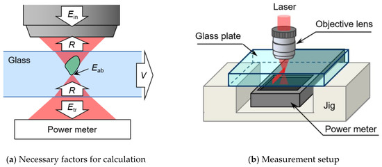 where Eab is the absorbed laser energy, Ein is the input laser energy, R is the reflectivity at the surface of glass, and Etr is the transmitting laser power [19]. Measurement of the absorption rate Aab would be helpful to understand the formation of molten area deeply and hence, discussion of the size of molten area. As shown in Figure 5a, the reflectivity R, input laser energy Ein and transmitting laser power Etr are the necessary factors to calculate the absorption rate Aab using Equation (1). Since the reflectivity R and the input laser energy Ein are known, the transmitting laser power Etr should be experimentally measured to obtain the absorption rate Aab. As can be seen from Figure 5b, the laser beam was focused inside the glass specimen fixed on a jig by the objective lenses of various numerical apertures, and a photodiode type power meter was placed 2.0 mm below the glass specimen to measure the transmitting laser power Etr. At this point, reflection and scattering phenomena of laser beam were not considered, and the measurement and calculated results were recorded as the absorption rate Aab.