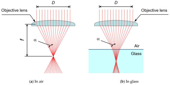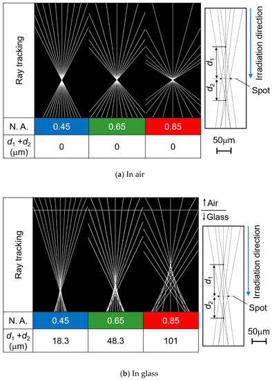 In order to investigate the influence of numerical aperture on focusing situation, an analysis of ray tracking for numerical apertures 0.45, 0.65, and 0.85 in air and glass were carried out, respectively. The analysis model of ray tracking is shown in Figure 6. Ray tracking is defined as the path that laser beam went through when focused in air or glass, which is helpful to discuss the power density. Thirteen rays of laser beam were initially set in the distance D as the diameter of laser beam at the objective lens. In this analysis, 9.0 mm, 6.0 mm and 5.8 mm were defined for the cases of N.A. 0.45, 0.65, and 0.85, respectively. In other words, the density of ray was 1.44 rays/mm, 2.17 rays/mm and 2.24 rays/mm, respectively. Moreover, the angle of incidence α was 26.74°, 40.54°, and 58.21°, respectively, for corresponding numerical aperture in air, which was calculated using Equation (2).