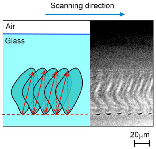 Optical microscope was used to observe the side view of molten area in the scanning direction of laser beam, as shown in Figure 7. The laser beam was tightly focused inside glass by objective lens of N.A. of 0.65 with spherical aberration correction. The pulse repetition rate, scanning velocity, and pulse energy were 1.0 MHz, 100 mm/s, and 1.5 µJ, respectively. As can be seen from the figure, the starting point of laser absorption was created when an ultrashort pulsed laser beam was tightly focused inside the glass, and the absorption area was expanded by the upward movement of the absorption point. Then, this absorption point was dropped down and shifted to the right side to complete the first cycle of molten area formation, and new starting point of laser absorption was established. The process was repeated periodically, and the welding lines were created. Therefore, molten area was not created by only one laser shot, but by the sum of multiple laser shots [19]. It is considered that the focusing condition such as numerical aperture has a great influence on this phenomenon, which is strongly related to the absorbed energy of the laser beam.