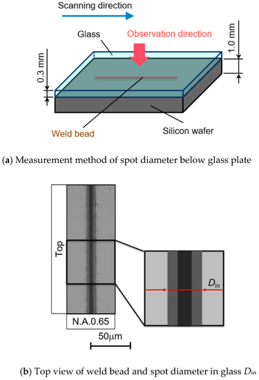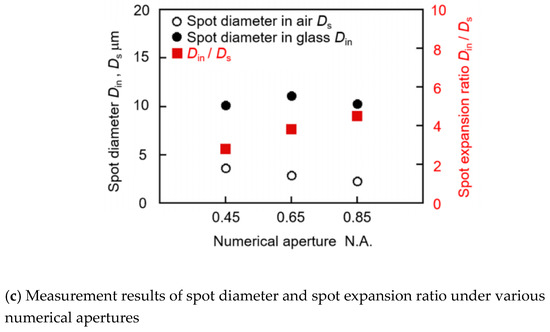 Figure 9 shows the measurement results of laser spot focused in glass. As shown in Figure 9a, the glass plate of 0.3 mm thickness and monocrystalline silicon wafer of 1.0 mm thickness were placed together by optical contact, and then laser beam was focused and scanned around the interface of these two materials from the glass plate side. The top view of the formed weld bead in the case of N.A. of 0.65 and the definition of spot diameter in glass Din are shown in Figure 9b,c shows the measurement results of spot diameter in glass Din, spot diameter in air Ds and spot expansion ratio Din/Ds with various numerical apertures. Din/Ds is the ratio of spot diameter in glass and spot diameter in air, which determines the expansion ratio of laser spot in glass to that in air. As can be seen from Figure 9c, spot diameter in air Ds decreased with increasing numerical aperture. The laser spot in glass was expanded, compared to that in air for all numerical apertures of objective lenses, which was caused by refraction of laser beam in glass. In addition, higher numerical aperture showed larger spot expansion ratio than lower numerical aperture, which indicated that laser spot was largely expanded. This result agreed well with the conclusion of ray tracking that higher numerical aperture caused a loose focusing situation in glass. Therefore, numerical aperture has a great influence on the focusing situation of laser beam in glass, and it is important to choose a proper numerical aperture of objective lens in the fusion micro-welding of glass.