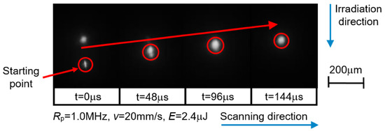 The absorption of laser energy is based on multi-photon ionization and avalanche ionization of nonlinear phenomenon, when an ultrashort pulsed laser beam is tightly focused inside the glass. The focusing point is considered as the starting point for laser absorption, which is defined as the absorption point. In this study, high-speed video camera was used to observe the absorption point movement without illumination light. Only plasma light was observed during this observation, which was easy to recognize the absorption point, as shown in Figure 10. The laser irradiation condition of pulse repetition rate 1.0 MHz, scanning velocity 20 mm/s and pulse energy 2.4 µJ was employed in this experiment. In order to estimate the amount of effective laser pulses that reached the glass per spot volume, the number of overlapped laser pulses N was calculated using Equation (3).