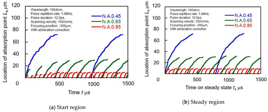 Then, the location of absorption point was measured in these captured images by calculating the feed rate of specimen. The location of lowest point of absorption movement was set to 0 µm, and the direction to the laser source was considered as positive value. These measurement results were arranged as the relationship between location of absorption point La and time for various numerical apertures, which indicated the influence of numerical aperture on formation phenomena of molten area, as shown in Figure 11. Figure 11a shows the measurement results at the start region of laser irradiation. N.A. of 0.45 showed a constant maximum location of absorption point from the start. On the other hand, maximum location of absorption point movement during one cycle increased with time at beginning in the case of N.A. of 0.65 and 0.85. Then, the location of absorption point of these two numerical apertures took a constant maximum value, and each cycle of absorption point movement was almost constant after 400 µs and 300 µs, respectively. This state was referred to as the steady region. After recounting the time, the relationship between Ha and time of the steady region is shown in Figure 11b. It can be seen that location of absorption point was varied by numerical apertures. Lower N.A., which showed a constant maximum location of absorption point from start of irradiation, obtained a larger location of absorption point and longer cycle of absorption point movement in the steady region, compared with higher N.A. However, longer movement of absorption point in case of lower N.A. caused longer cycle of heating and cooling in the upper and lower parts of molten area, and thus the imbalance of temperature distribution would result in a large thermal stress and unstable phenomena. In contrast, higher N.A., which showed increasing location of absorption point at the start of irradiation, obtained smaller location of absorption point and shorter cycle of absorption point movement in the steady region. Thus, accurate control of absorption point could be expected by using the objective lens of higher N.A. On the other hand, in the case of N.A. of 0.65 and 0.85, it is considered that micro-welding without cracks can be achieved in a wide range of irradiation conditions because of smaller location of absorption point, shorter cycle of absorption point movement, and shorter cycle of heating and cooling.