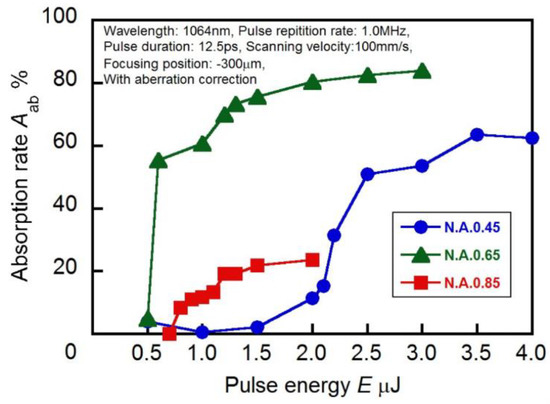 Influence of numerical aperture on formation phenomena of molten area was investigated through measuring the absorption rate Aab, which was calculated using Equation (1).