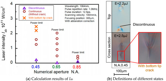 where Ein is the input laser energy, Aab is the absorption rate, ds is the diameter of laser beam at focal point, and τp is the pulse duration [30]. These calculation results were shown in Figure 13a, in which the triangular marks show discontinuous creation of molten area, the circular marks show the continuous creation of molten area without crack, and the cross marks show appearance of crack at the bottom tip. Figure 13b shows the example of these different states observed by the optical microscope, in the case of N.A. of 0.45. The discontinuous creation of molten area was observed from the top view at the pulse energy of 2.2 µJ, and the crack appeared at the bottom tip of molten area, as shown in cross sectional view at the pulse energy of 2.5 µJ. As can be seen from Figure 13a, N.A. of 0.65 can create a molten area without crack by using the highest laser intensity. This phenomenon shows that N.A. of 0.65 can absorb higher laser energy without cracks, which is expected to result in a large size of molten area compared with other N.A values. Therefore, objective lens with N.A. of 0.65 can achieve stable and efficient formation of molten area. The change in size of molten area under different pulse energies by various numerical apertures will be discussed later.