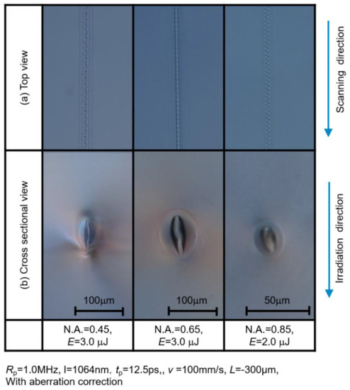 Figure 14 shows the optical micro-photographs of the molten area observed from top and side direction for various numerical apertures. As can be seen from the figure, N.A. of 0.65 can achieve a larger size of molten area without crack generation from cross sectional view. However, the cracks were generated at the bottom tip of molten area, when N.A. of 0.45 was used. In the case of N.A. of 0.85, the size of molten area was small compared with N.A. of 0.45 and 0.65, although a laser beam was tightly focused.