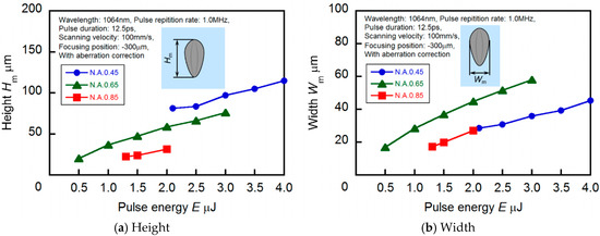 Next, influence of numerical aperture on the size of molten area was investigated by measuring the height and width of molten area from cross sectional view under different pulse energies, as shown in Figure 15. The size of molten area varied with change of numerical apertures, which was mainly because the location of absorption point was changed by numerical apertures as mentioned above. On the one hand, the size of molten area increased with increasing pulse energy with all numerical apertures, which is in accordance with the previous results that absorption rate increased with increasing pulse energy for all numerical apertures. On the other hand, lower numerical aperture could create a larger molten area, and the width by N.A. of 0.65 was the largest among all numerical apertures. This phenomenon corresponded to the previous results that N.A. of 0.65 showed the highest absorption rate compared with N.A. of 0.45 and 0.85. In addition, it also can be seen that N.A. of 0.65 could be used in a wider range of pulse energies than other N.A. values, which suggests that N.A. of 0.65 was more appropriate for the micro-welding process. As for N.A. of 0.85, there was almost no difference between the value of the height and width of the molten area. This phenomenon indicated that the molten area with N.A. of 0.85 did not elongate along laser beam axis evidently, which required accurate control of focusing position in the micro-welding of glass. In conclusion, it can be expected that absorbed energy in glass is higher and thus the reliable joining can be achieved, when the size of molten area increases with increasing the pulse energy with numerical aperture such as N.A. of 0.65.