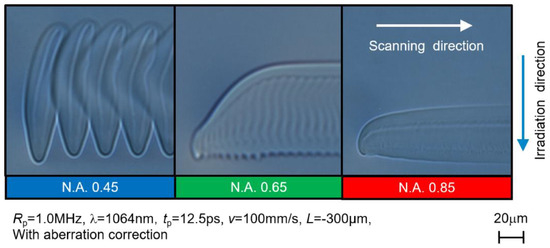 Figure 16 shows the optical micro-photographs of molten area in the scanning direction of laser beam. In this experiment, laser beam was irradiated 300 µm below the top surface of glass by objective lenses of various numerical apertures with spherical aberration correction at the conditions of pulse repetition rate 1.0 MHz and scanning velocity 100 mm/s. It can be seen that numerical aperture affected the shape of molten area, which varied with numerical aperture especially at the beginning of laser scanning. Lower N.A. such as 0.45 resulted in remarkable spike shape at the bottom of molten area, because absorption point dropped down from the top edge to the bottom one of molten area, and laser energy was not absorbed during this time. In addition, the highest points of absorption point were almost constant, and it could keep similar height of molten area from the beginning as shown in Figure 11. However, remarkable spike shape might cause crack on molten area, which would result in low mechanical strength of welded glass. On the other hand, in the case of higher N.A. such as 0.65 and 0.85, continuous molten areas were formed. In these cases, it can also be seen that the location of absorption point gradually increased from the beginning of laser irradiation, and it resulted in a certain critical value. This phenomenon indicated that the absorption point was simultaneously formed and overlapped in the upper and lower parts of the molten area as shown in Figure 7, thus continuous molten area was formed. Therefore, it can be expected that N.A. of 0.65 has superior focusing characteristics and can form continuous molten area, which leads to achieving a stable welding process and high mechanical strength of welded glass material.