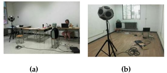 Binaural signal collection scene in real rooms. (a) Room A (b) Room B.