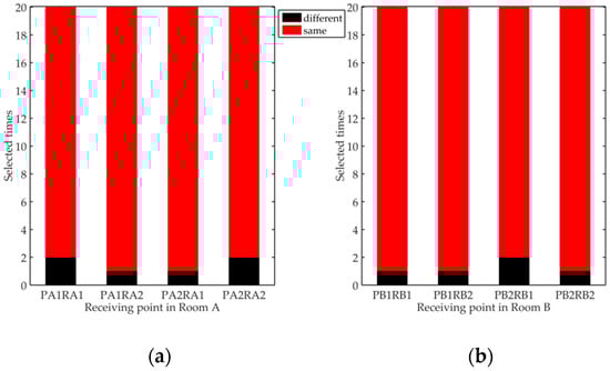 The evaluation results are analyzed and processed as shown in Figure 4. The red bar denotes the number of listeners who sense that the “real” and “simulated” binaural signals are coincident; the black bar denotes the number of listeners who sense that the “real” and “simulated” binaural signals are different. The longer the bar, the more numerous the selected times.