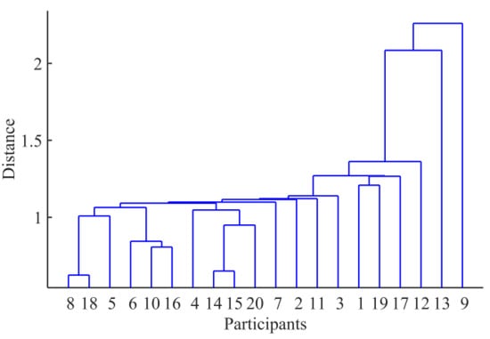 Cluster analysis of subjective experimental results. In the figure, the x-coordinate and the y-coordinate denote the subject number and the calculated distance, respectively. The larger the distance, the greater the difference between the participant’s evaluation result and other participants’.