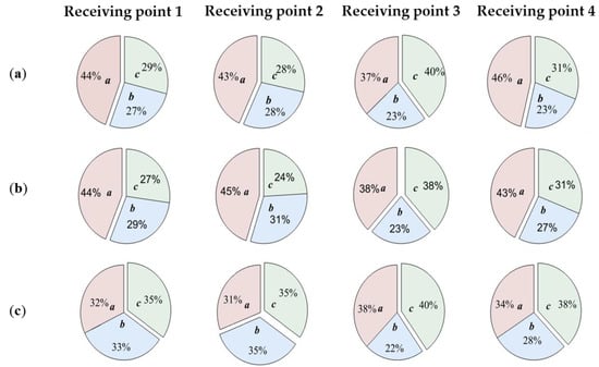 The changes of spatial sound field auditory of the three musical sounds. The colors represent different spatial models: red, blue, and green correspond to a, b, and c models in Table 4. The size of the fan indicates the number of the stimuli selected at a receiving point in this space; the larger the number being selected, the larger the fan area. (a) Flute; (b) Violin; (c) Symphony.