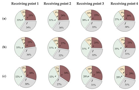 The spatial sound field auditory changes for different wall absorption coefficients for the three musical sounds. The colors represent different spatial models: green, gray, red, and yellow correspond to e, f, c, and d models. The size of the fan indicates the number of the stimuli selected at a receiving point in this space; the larger the number being selected, the larger the fan area. (a) Flute; (b) Violin; (c) Symphony.