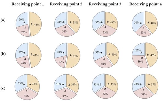 The spatial sound field auditory changes for the different space shape for the three musical sounds. The colors represent different spatial models: blue, red and yellow correspond to b, g, and h models. The size of the fan indicates the number of the stimuli selected at a receiving point in this space; the larger the number being selected, the larger the fan area. (a) Flute; (b) Violin; (c) Symphony.