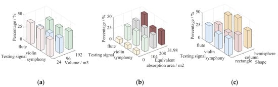 The sound perception changes caused by closed space parameters of (a) space volume, (b) wall surface sound absorption coefficient, and (c) space shape when the position of the receiving point is not considered. The x, y, and z axes represent the parameter change, the testing audio, and the corresponding percentage of the times being selected, respectively; the higher the percentage, the better the auditory perception.