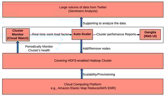 This work aims to provide an automatic scaling system which predicts the sentiment of the tweets of the people posted on social media. Hadoop clusters are employed to process the data and MapReduce programming is used to analyze the sentiment statistics on the Twitter dataset due to its capability in performing distributed and parallel processing on large data sets [,]. The data from different universities in the United Kingdom is collected by following a Twitter API link to perform sentiment analysis. It is worth noticing that the analysis of the universities’ Twitter data in the proposed CEAS framework has benefits over those based on the previous data sets in the sense that the tweets are now analysed in real-time.