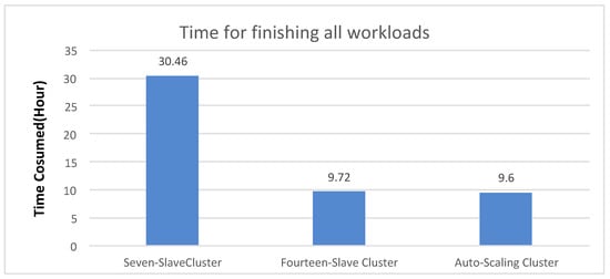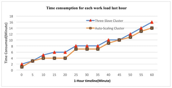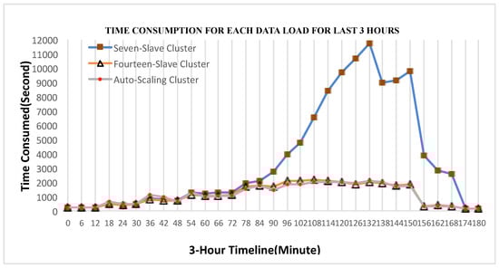 The fixed cluster setups of three, seven and fourteen slave nodes therefore restrict capacity to process the map reducing jobs on the streaming data load on the Hadoop cluster. Moreover, the results show that the time consumption of each workload for the auto-scaling cluster is almost the same as the fourteen-slave cluster setup. However, it can be noticed in Figure 4 that the auto-scaling cluster presents some fluctuations starting at 1.5 h. This is not the case for the fourteen-slaves cluster setup. The sharper fluctuations indicate the scaling-up of the resources on the cluster in order to finish the jobs on time. The scale-up performance involves adding task/slave nodes on the cluster to make sure that the jobs complete on time.