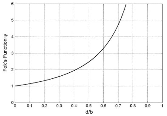 As shown in Figure 1, where Fok’s function is plotted against hole diameter (d) divided by hole separation distance (b), Fok’s function is always greater than 1 and increases with increasing d/b. Fok’s function appears in the denominator in Equation (4), therefore, the acoustic end correction length gradually diminishes with decreasing hole separation distance due to hole interaction effect. Melling [10] provided an explanation for the diminishing end correction by a simple diagram, as illustrated in Figure 2. He described the end correction effect as being the result of an “attached air mass” in the neighborhood of the perforation. Melling [10] claimed that a portion of “attached masses” for a perforation will overlap with the neighboring perforations if they are sufficiently close to each other. The overlapped portions of attached masses merge into one portion of attached mass, and as a result the average attached mass for each perforation is reduced. However, Melling [10] did not provide an explanation about the underlying physics of why the two merged “attached masses” would merge and result in a reduced total “attached mass”.