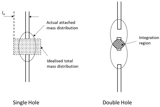 Therefore, it may be considered that the end correction due to acoustic radiation for an individual hole is not affected by the acoustic radiation effect, due to the overall perforation area. The acoustic radiation effect from the perforation area as a whole manifests itself by forming an extra acoustic radiation effect in the vicinity of the overall perforated area. The acoustic radiation effect of a perforated plate is treated as a superimposition of two radiation effects: the “individual hole radiation effect” and the “overall perforation region radiation effect”. An acoustic signal experiences the single hole radiation effect and the perforation region radiation effect simultaneously. A simple model is proposed in this paper by assuming that acoustic end correction lengths caused by these effects are additive.