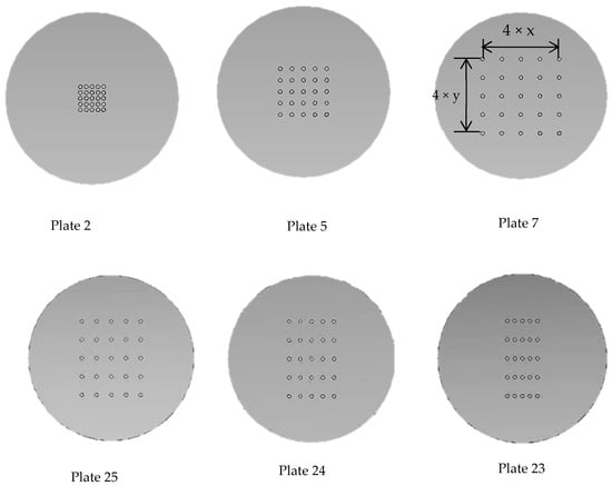 A total of 32 circular perforations, as exemplified in Figure 9, were drilled in the x and y directions, respectively. The diameters of these orifices were 2 mm, 3 mm, or 4 mm. The thickness of all experimentally tested plates was kept the same at 2 mm.