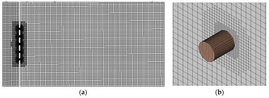 The phenomena of acoustic radiation takes place in close proximity to the individual holes in the perforated plate. Therefore, this requires a computational grid of sufficient resolution to capture the local fluid dynamic and acoustic phenomena. The structural composition of the computational grid employed in this work is illustrated in Figure 5. Block-structured meshes with a cell size of 2.6 mm were built within the air cavity and impedance tubes, as shown in Figure 5a, and block-structured meshes were further refined near the orifices until the mesh size reached a minimum of 0.2 mm in the orifice, as shown in Figure 5b. A further mesh with a resolution of 0.1 mm in the orifice was generated for a separate test of grid dependency.