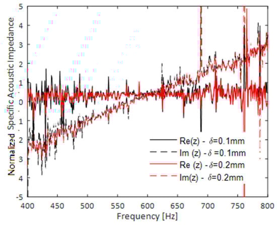 A two-microphone transfer function was employed for acoustic analysis [23]. The normalized specific acoustic impedance of the plate absorber is defined by Kuttruff [4] as: