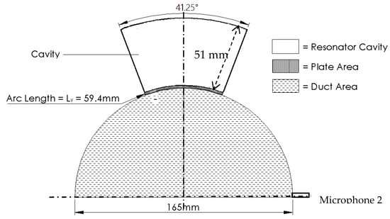 The resonant cavity, Figure 8, was constructed from a curved rectangular test plate with a length of 0.05 m and an arc length of 0.0594 m, mounted flush to the side wall of the test section duct, with an attached fan-shaped cavity of 0.051 m depth. Referring to Figure 8, the volume of the cavity is: