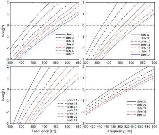 Figure 10 displays normalized specific acoustic reactance curves for the full set of twenty-five plates (Table 1) for which results were obtained using CFD simulation. All four sub-figures demonstrate that the acoustic reactance curves shift to lower frequencies as the distance between individual holes within a perforated plate decreases. According to Equation (1), these reductions in resonance frequencies imply that the end correction length increases with the decreasing hole separation distance. This is contrary to Fok’s function [8], which suggests that hole interaction effect reduces the overall acoustic end correction length, as given in Equation (4).