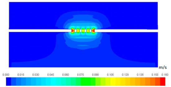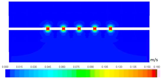 The acoustic velocity magnitude in the vicinity of the perforations is visualized using the results from the CFD simulations of Plate No. 7 with distantly spaced holes, shown in Figure 11, and Plate No. 2 with closely spaced holes, shown in Figure 12. Figure 13 presents a cross-section view of the same holes.
