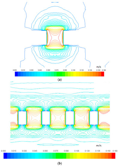 Acoustic velocity magnitude contour near an orifice with different hole separation distance: (a) plate No.7 absorber: x/d = 5, y/d = 5, (b) plate No.2 absorber: x/d = 1.5, y/d = 1.5.