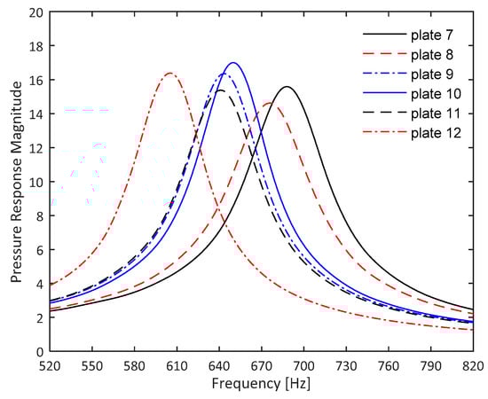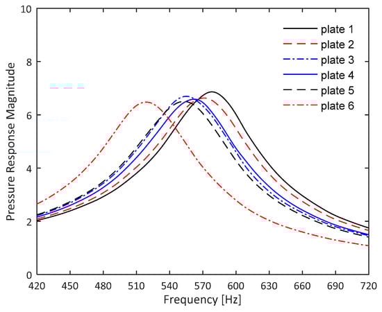 Figure 15, Figure 16 and Figure 17 display the magnitude of pressure response functions between microphone 1 in the resonator and microphone 2 in the acoustic propagation duct. The experimental results suggest that resonance frequencies of PPAs shift to lower frequencies as the holes approach each other. This finding is in agreement with CFD investigations within a wide range of effective porosities from approximately 0.04 to 0.54. This range of 0.04–0.54 covers the effective porosity of most practical PPAs that exhibit a hole–hole acoustic interaction effect. An even lower porosity than 0.04 does not exhibit a noticeable hole–hole interaction effect. A higher effective porosity than 0.54 is not investigated because a PPA with higher effective porosity is nearly a single hole in terms of acoustic radiation effect (for example, for a plate with an effective porosity of 0.6, the ratio of hole diameter (d) to hole center distance (b) is 0.874, which means the orifice is so close that only a distance of 0.126d exists in between their edges).