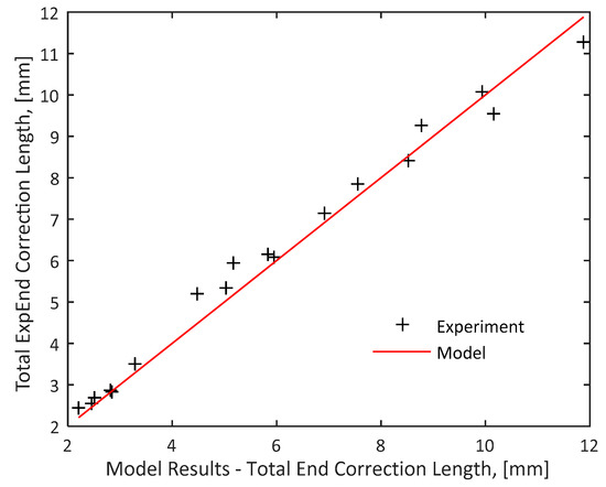 Resonance frequencies of all eighteen PPAs are determined from Figure 15, Figure 16 and Figure 17 and then listed in Table 4. Then, the experimental end correction length was calculated by employing Equation (1). End correction lengths acquired by the proposed model (Equation (17)) are similarly provided in Table 4.