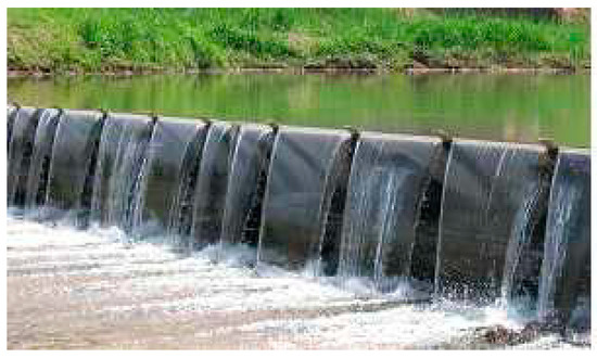 A weir installed across a river must contain the river and secure water resources under normal circumstances, enabling sufficient water to pass over the cross-sectional area in times of flooding [1,2,3,4]. A fixed weir often causes overflow in the upper stream in times of flooding, which causes problems such as degraded river water flux due to soil accumulation. As a result, many existing concrete fixed weirs are no longer functional and are being demolished. The current trend is to re-install moveable weirs [1,5,6,7].