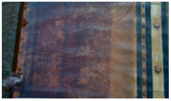 Improved moveable weirs boast the advantages of rubber weirs and flipping gates and have been in use since the 1980s [1,2,5,6,7,11,12,13]. Figure 1 shows an improved moveable weir [1,7]. It uses steel panels for all parts except the air bag, so there is concern regarding corrosion in a river environment as well as various other problems such as decreased durability with long-term use and possible river ecosystem damage due to the leakage of corrosive materials [1,5,6,7]. Figure 2 shows the corrosion of the steel panels [1,7].
