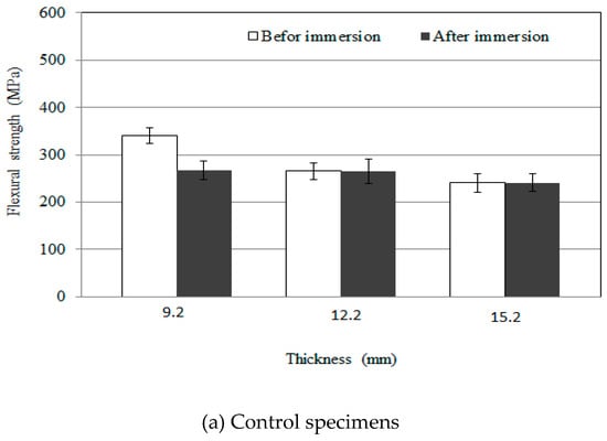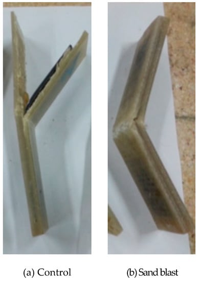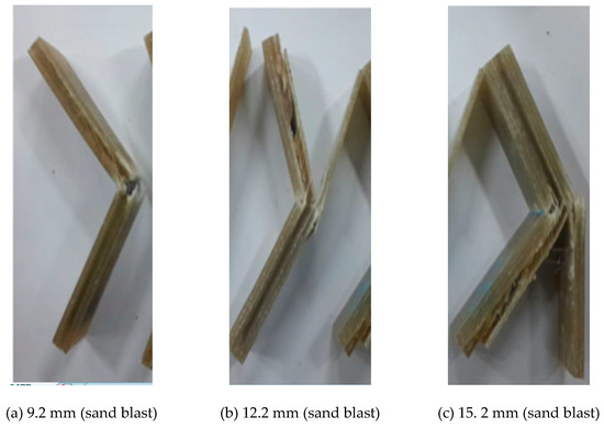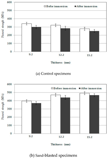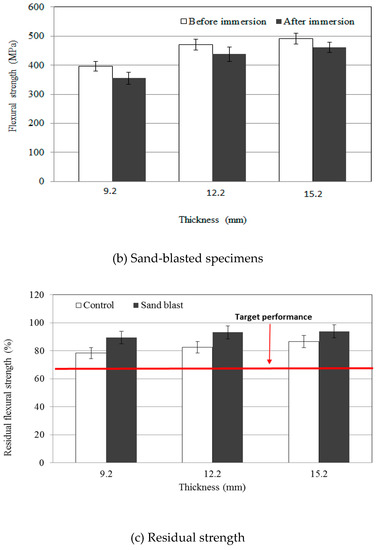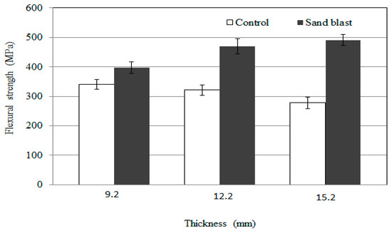 Flexural strength test results as a function of GFRP panel thickness are shown in Figure 7. The control specimens showed flexural strengths of 341.33, 321.26, and 287.11 MPa, respectively, as the GFRP panel increased in thickness from 9.2 to 12.2 to 15.2 mm. The flexural strengths of the sand-blasted specimens were 397.13, 470.21, and 491.11 MPa, respectively.