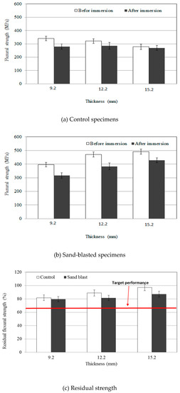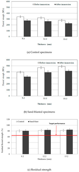 - Both flexural strength and residual strength increased as a function of panel thickness after exposure to accelerated environmental conditions. Higher residual strengths were obtained with sand-blasted specimens.