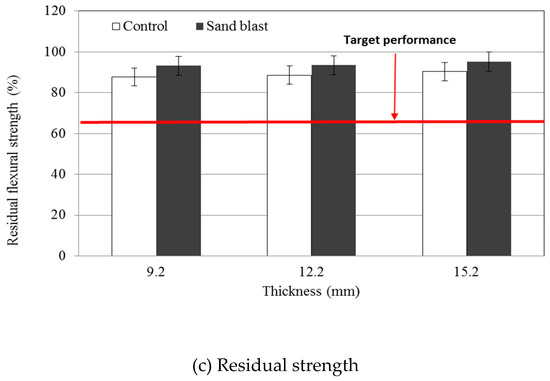 The results of long-term high-temperature environment exposure are shown in Figure 12. As the thickness of the hybrid panel increased from 9.2 to 12.2 to 15.2 mm, the flexural strengths of the control specimens were 299.36, 284.78, and 251.29 MPa, respectively, while those of sand-blasted specimens were 370.21, 439.68, and 467.21 MPa. Fracturing of the GFRP composite materials by heat occurs due to differences in the thermal expansion coefficients of the different materials, especially the glass fiber and the polymer resin. At high temperatures, the glass transition temperature of the polymer resin becomes an important factor in determining the strength of the hybrid panel. In addition, the possibility of fracture between the steel and GFRP panels is also high. Flexural strength decreased as the thickness of the panel increased. The reason for this was the combined influence of differences in the thermal expansion coefficients of the steel and GFRP panel and the glass transition temperature of the polymer resin. The reason for decreasing flexural strength as a function of increasing panel thickness was the influence of the resin glass transition temperature on the mechanical integrity of the GFRP panel. In addition, unmodified steel control panels were significantly weaker than sand-blasted panels due to fracturing at the steel/GFRP interface and the greater interfacial bond strength of the sand-blasted specimens. Regarding the residual strength, all of the tested panels satisfied the goal of this study (≥ 65%; Figure 12b). As the thickness of the hybrid panel increased from 9.2 to 12.2 to 15.2 mm, the control specimens showed residual strengths of 87.70%, 88.64%, and 90.35%, respectively, while those of sand-blasted specimens were 83.22%, 93.51%, and 95.13%. Thus, sand-blasted specimens exhibited higher residual strength because of their higher interfacial bond strengths. Interfacial delamination was also suppressed despite the significant differences in the thermal expansion coefficient.